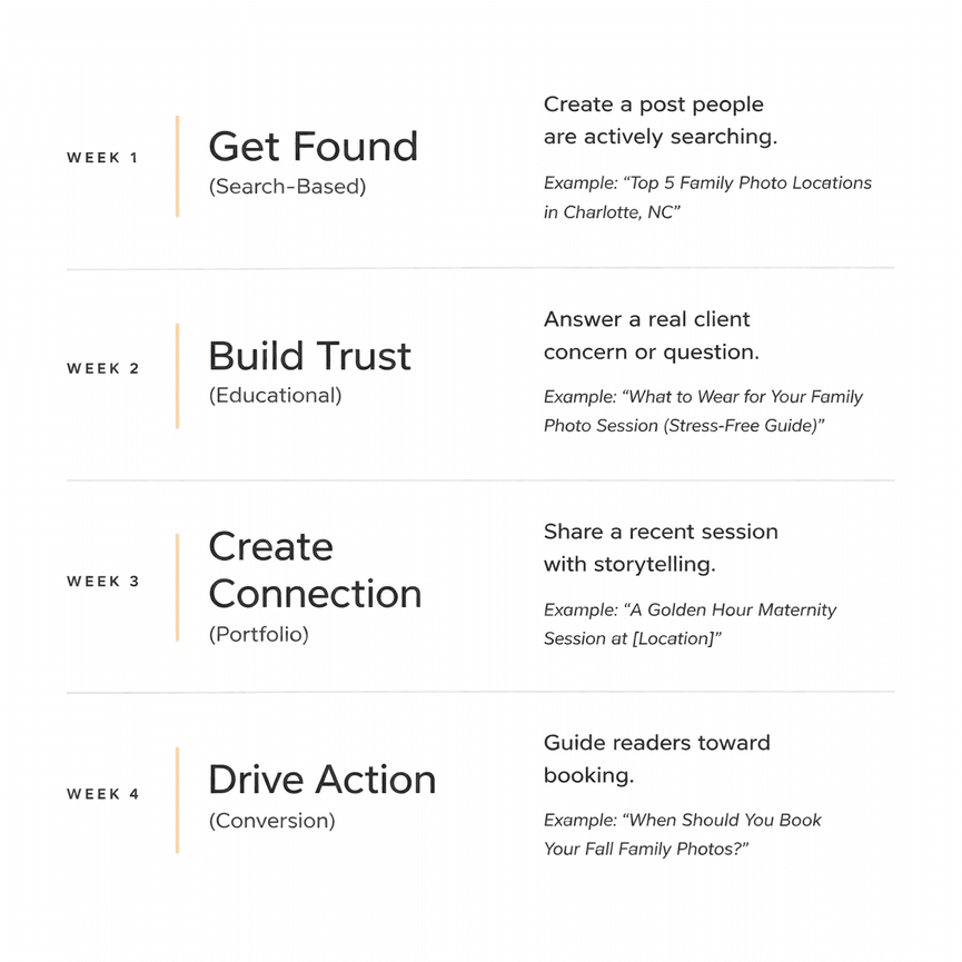 Instead of guessing what to post, follow a structure that covers all four pillars every month. We'll use family photography as example, but you can do this any type of photography.